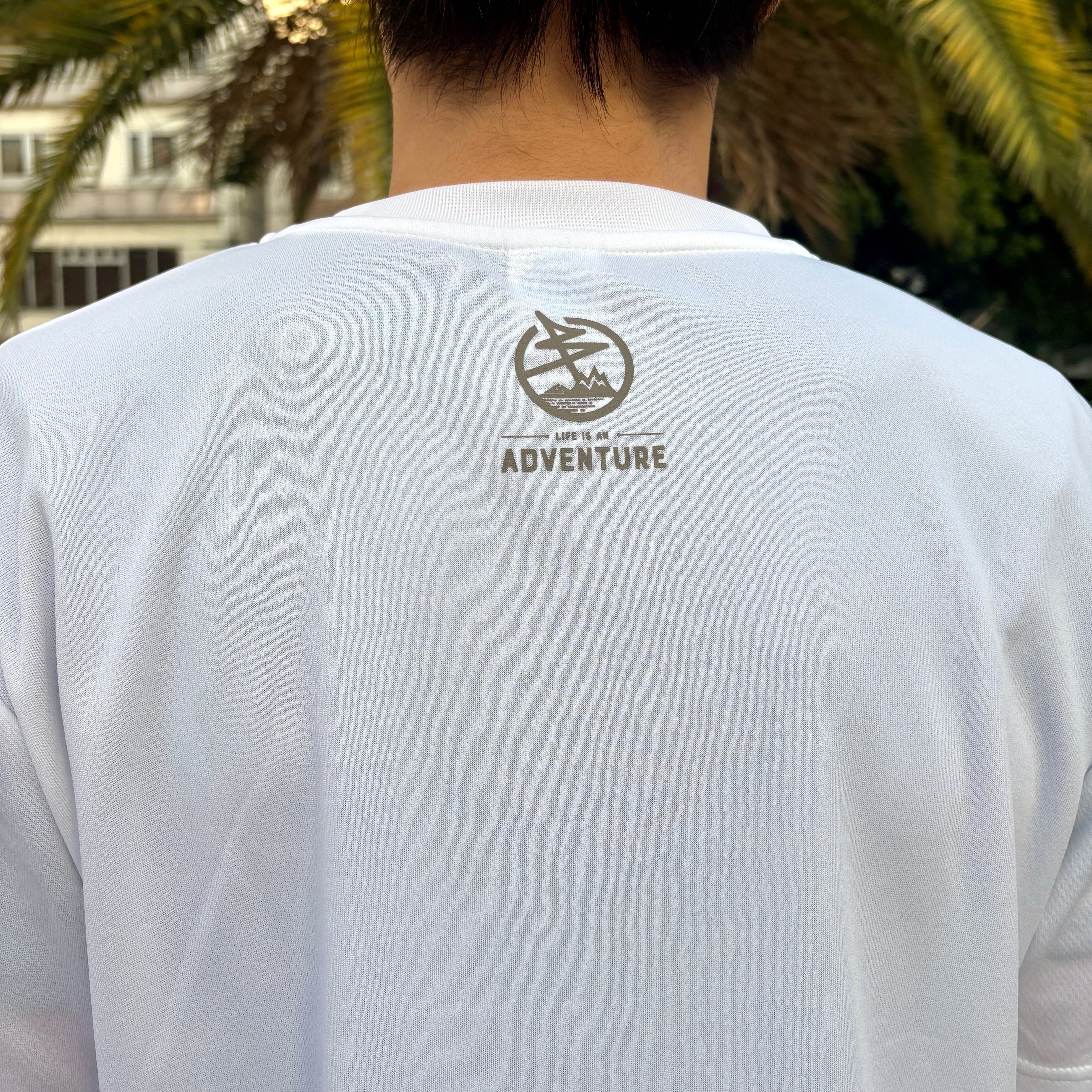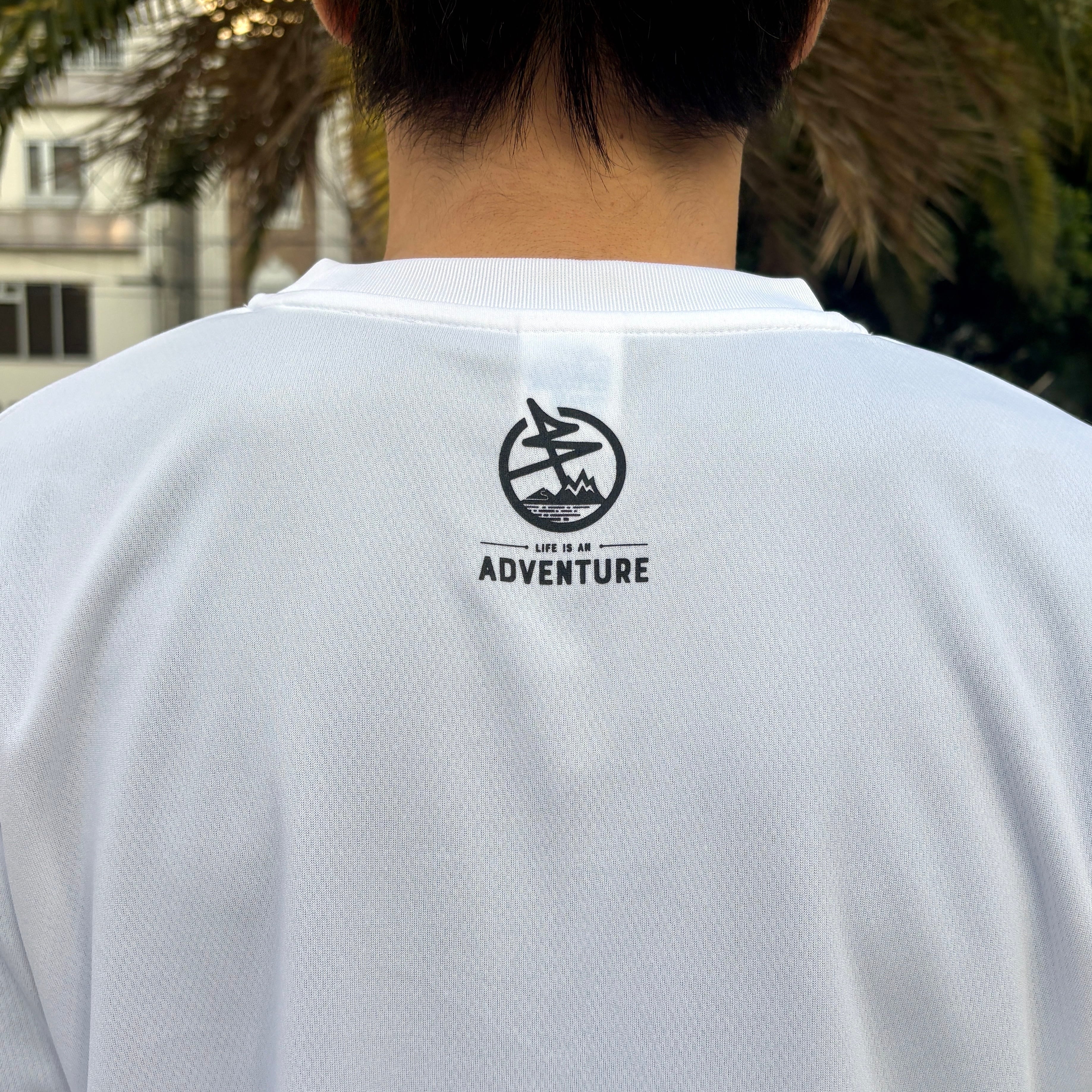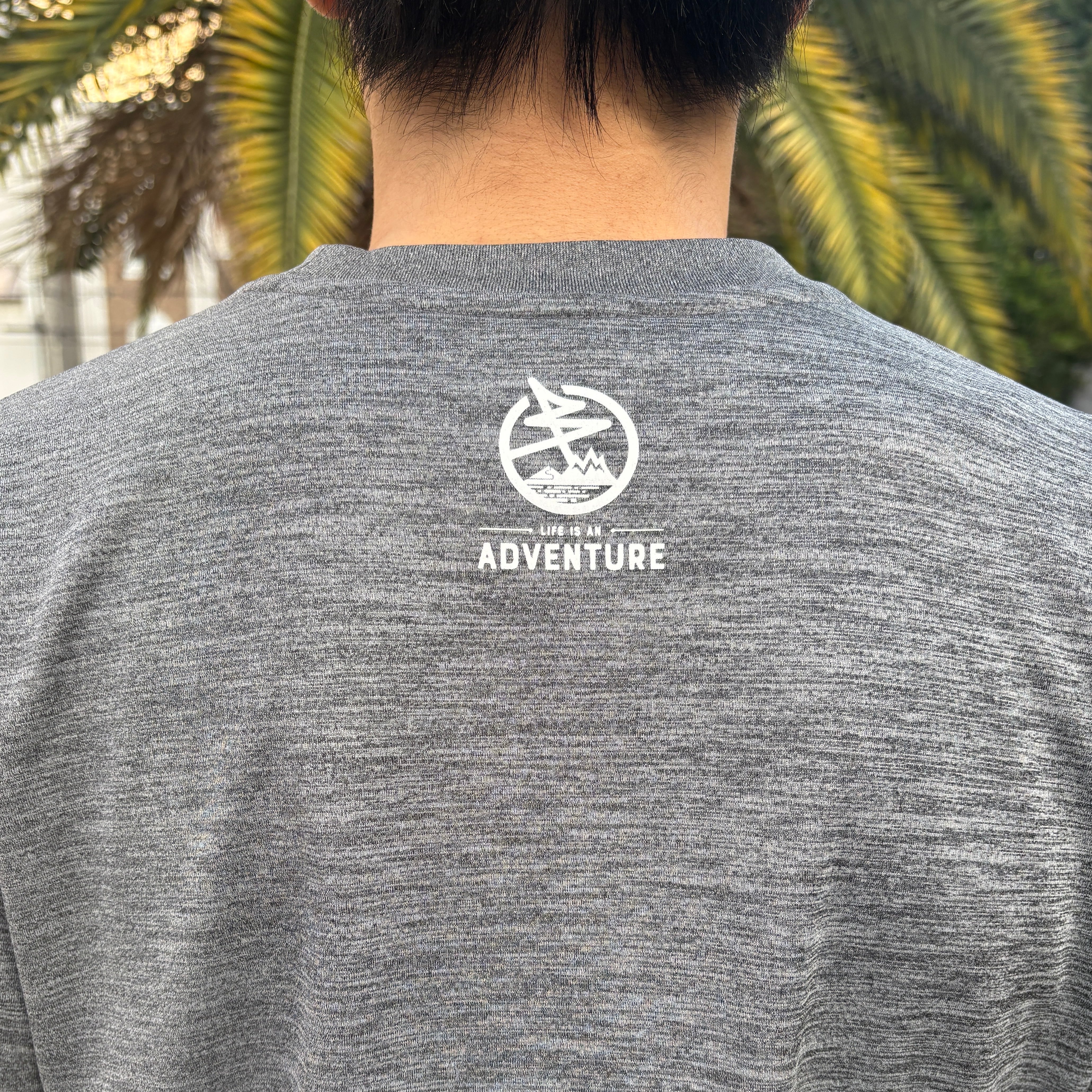 背中の上部に、北田雄夫ロゴとLife is an ADVENTURE(人生は冒険だ)という、「挑戦を楽しもう」というメッセージを添えています。