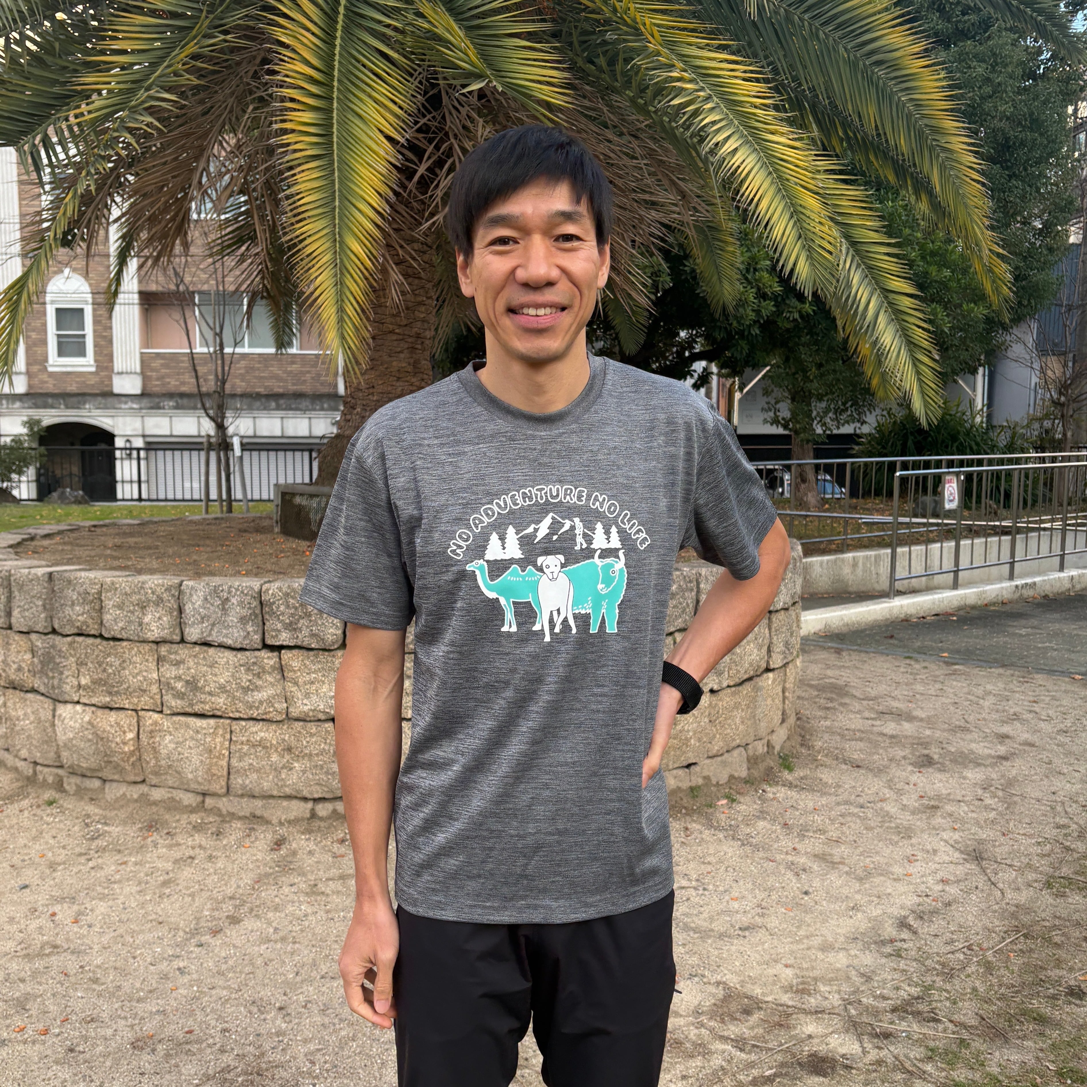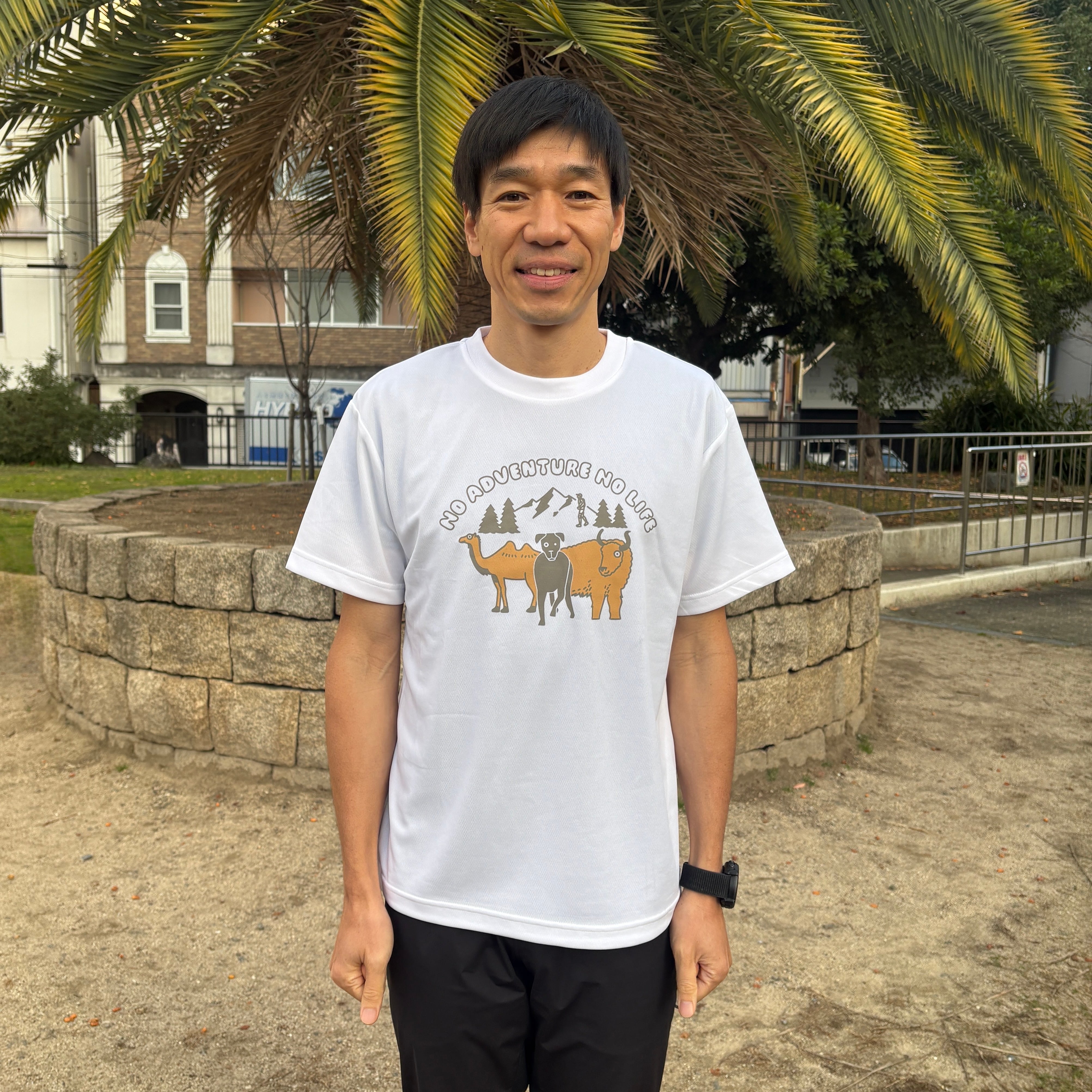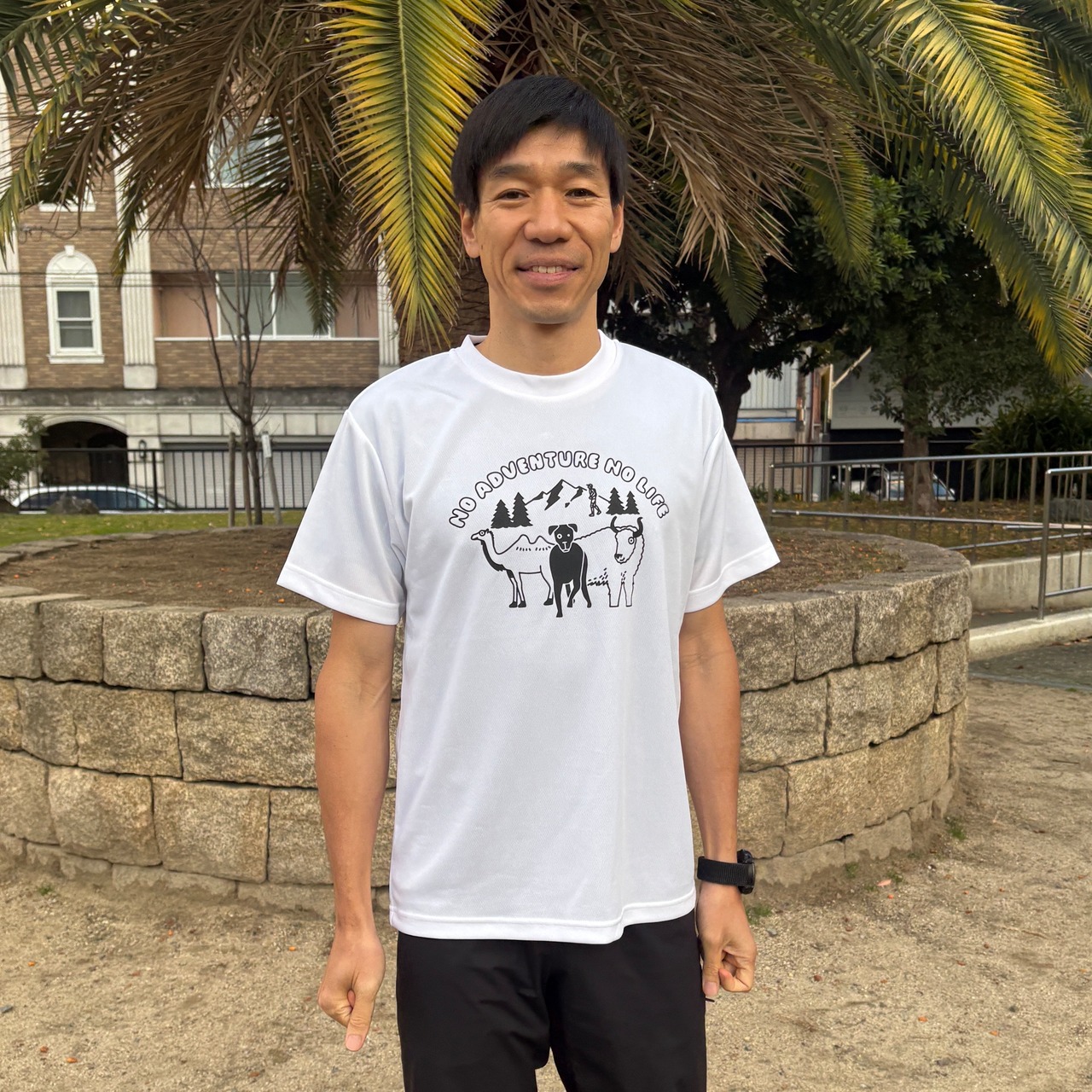 背中の上部に、北田雄夫ロゴとLife is an ADVENTURE(人生は冒険だ)という、「挑戦を楽しもう」というメッセージを添えています。